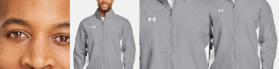 - UA woven label centered on left sleeve hem and UA heat seal center back neck
