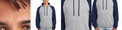 8-ounce, 50/50 cotton/polyester NuBlend ® pill-resistant fleece Made with sustainably sourced USA-grown cotton High stitch density for a smooth printing surface Jersey-lined hood No drawcord in hood Contrast raglan sleeves Athletic-inspired varsity stripes on sleeves Front pouch pocket 1x1 rib knit cuffs and hem Double-needle coverstitching on armholes and hem Tear-away label