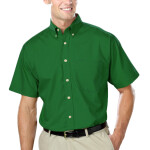 For a shirt with short sleeves but not short on style, look no further than this men's easy-care 5.5 oz. poplin shirt! Made of a 65% polyester/35% cotton blend with stain release, this wrinkle- and crease-resistant item features a patch pocket, a double-back yoke, two side back pleats, hemmed sleeves and a button-down collar.