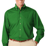 This shirt will definitely pop! Made of a 65% polyester/35% cotton blend, this easy-care and lightweight 5.5 oz. men's long-sleeve poplin shirt has stain-release technology and is also wrinkle/crease resistant. It features a patch pocket, a double-back yoke, two side back pleats, bone-horn buttons and a button-down collar.