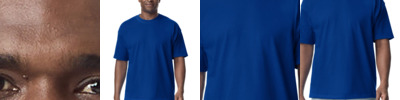 4.6-ounce, 60/40 ring spun cotton/polyester CVC blend Subtle heather texture on all colors except Pitch Black and White Recycled, high-performing black tear-away label Softstyle's high stitch density fabric offers a smoother printing surface Narrow width, rib collar Taped neck and shoulders Modern classic fit, seamless body Double-needle hem Rib cuffs