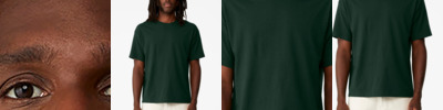 4.45-ounce, 100% US cotton 90/10 cotton/polyester (Sport Grey) 50/50 cotton/polyester (Heathers) Non-dyed fabric with visible specks of fibers and cotton seeds (Natural) Narrow width, rib collar Taped neck and shoulders Modern classic fit, seamless body Recycled, high-performing black tear-away label