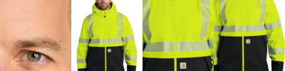 Stay seen and stay dry on the site in this high visibility sweatshirt that meets ANSI/ISEA 107 Class 3 standards. 10.5-ounce, 100% polyester Meets ANSI 107 Class 3, Type R visibility standards 3M Scotchlite reflective material segmented for breathability Rain Defender ® durable water repellent Three-piece adjustable hood Locker loop Hidden media pocket inside right handwarmer pocket Stretchable, spandex-reinforced, rib knit cuffs and waistband Front handwarmer pocket with flaps for security Carhartt label sewn on left handwarmer pocket Reflective material maintains performance through 75 home launderings Loose fit