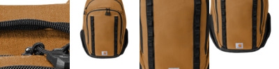 1200D heavy-duty polyester Rain Defender ® durable water repellent (DWR) Large main compartment with dedicated tablet sleeve Top compartment with dedicated pocket for power pack and cord port Front zippered organization 2 exterior mesh pockets Padded compartment with dedicated 15-inch laptop sleeve Contour-fit shoulder straps with FastDry ® sweat-wicking technology Padded air mesh back panel with a webbing strap that can fit over dual trolley handle of wheeled bag Carhartt label sewn on front top pocket Duravax abrasion-resistant base Capacity: 28L Dimensions: 18'h x 12'w x 10'l; Approx. 1,709 cubic inches Note: Bags not intended for use by children 12 and under
