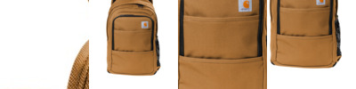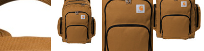 Tough enough for the jobsite and spacious enough for a weekend trip, this backpack can keep the elements at bay and has plenty of pockets to organize and store your gear. A dedicated laptop sleeve keeps your computer protected. 1200D heavy-duty polyester Rain Defender ® durable water repellent (DWR) Large main compartment with zippered mesh pocket Back compartment with dedicated 17-inch laptop sleeve and tablet sleeve Zippered compartment with fleece lining for safety glasses storage 2 side zippered pockets Zippered organizational compartment and additional zippered front pocket Contour-fit shoulder straps Padded air mesh back panel with webbing to carry over dual trolley handle system Carhartt label sewn on front Capacity: 28L Dimensions: 18'h x 12'w x 10'l; Note: Bags not intended for use by children 12 and under.
