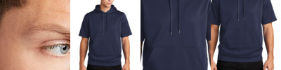 Made for layering, this moisture-wicking hoodie has trend-right short sleeves for more mobility. 5.5-ounce, 100% polyester Anti-static Tag-free label Three-panel hood No drawcords at hood Taped neck Self-fabric hem Front pouch pocket